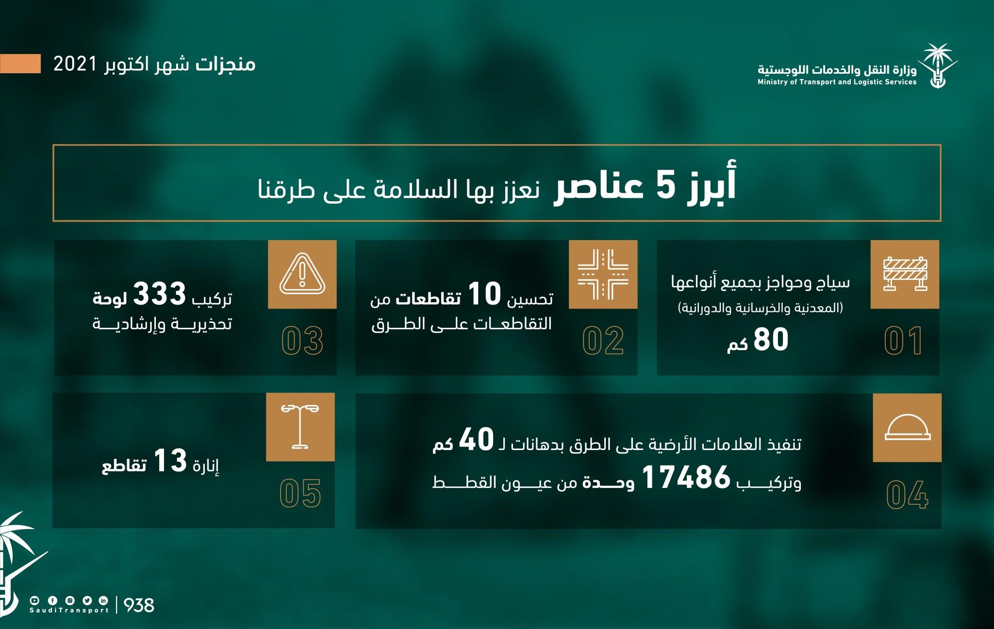 النقل والخدمات اللوجستية تنجز عدة أعمال للسلامة على طرقها خلال شهر أكتوبر