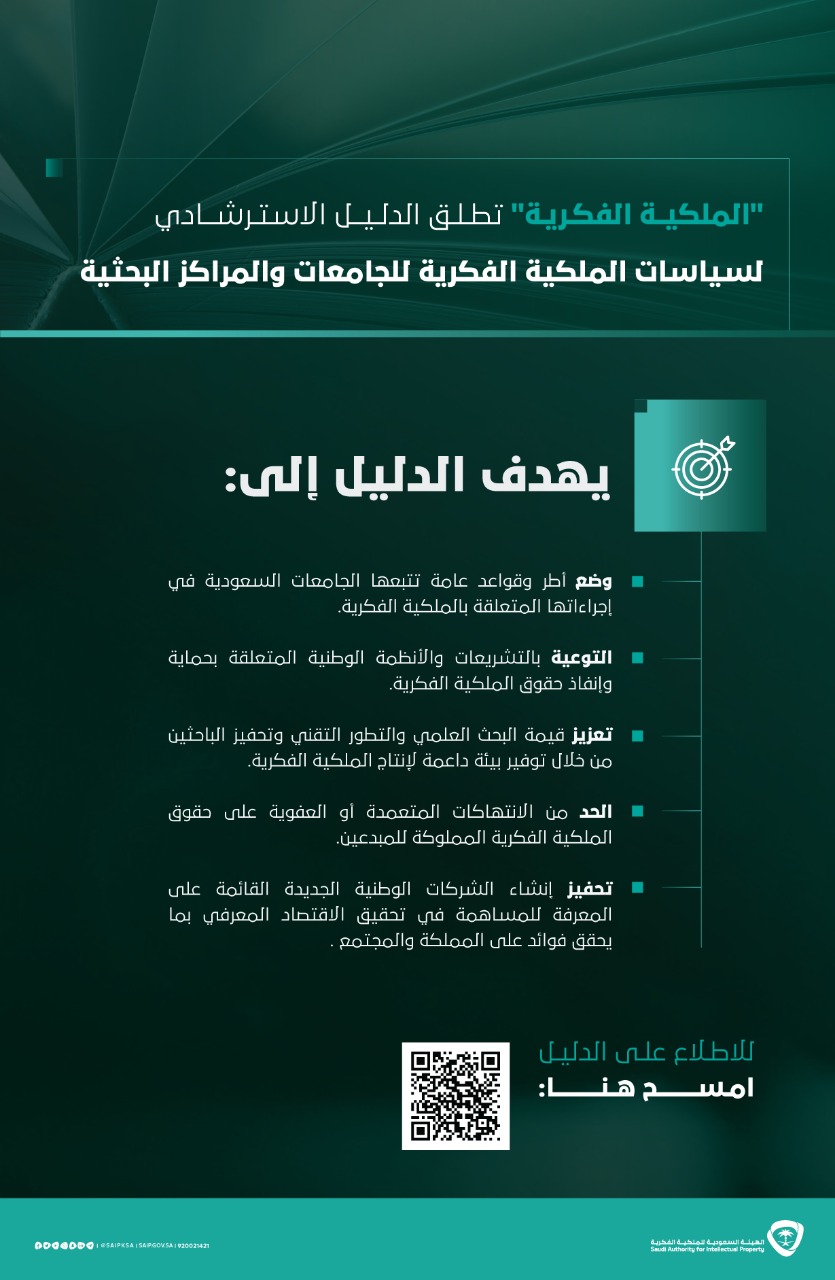 أطلقت الهيئة السعودية للملكية الفكرية الدليل الاسترشادي لسياسات إدارة وحماية واستغلال الملكية الفكرية لصالح الجامعات والمراكز البحثية الوطنية لتتبناها في تطوير سياساتها الداخلية ذات العلاقة بما يتلاءم مع استراتيجياتها ومصالحها، حيث يوفر هذا الدليل العناصر الأساسية التي من الممكن العمل عليها لتعزيز القيمة المعرفية والاقتصادية الناتجة من مشاريعها البحثية.
