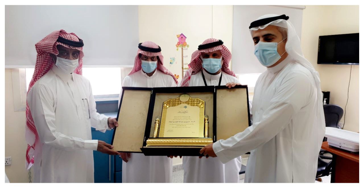 قام الرئيس التنفيذي بالتجمع الصحي بالأحساء الدكتور خالد بن محمد الملا بتكريم مشرف مركز صحي القارة بالأحساء الأستاذ – حسين بن عبدالله العبدرب الرضاء درعاً تذكارياً