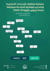 873 مخالفة للإجراءات الاحترازية والتدابير الوقائية من فيروس كورونا خلال أسبوع