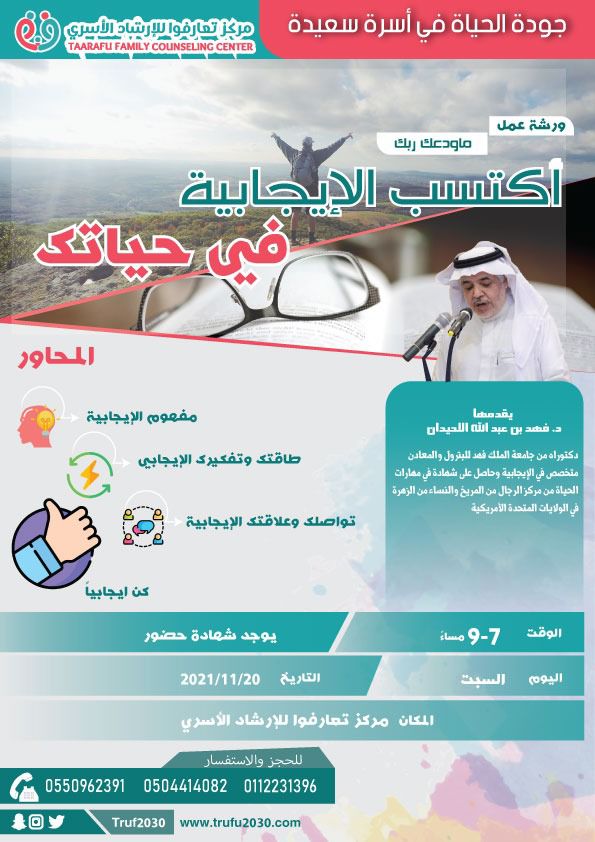 يقيم مركز تعارفوا للإرشاد الأسري ورشة عمل بعنوان”ما ودعك ربك… أكتسب الإيجابية في حياتك، التي ستقام عبر الزوم يوم