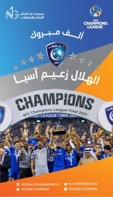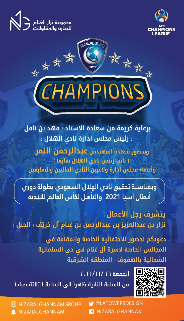 تكريمآ وإحتفاءآ لنادي الهلال بعد تحقيقه لقب كأس دوري أبطال آسيا 2021 وتأهله لنهائيات كأس العالم للأندية ؛ يقيم حاليآ رجل الأعمال المعروف الشيخ / نزار بن عبدالعزيز الغنام ( الجبل ) يوم مفتوح برعاية رئيس مجلس ادارة نادي الهلال و حضور سعادة المهندس / عبدالرحمن النمر ( نائب رئيس نادي الهلال السعودي )