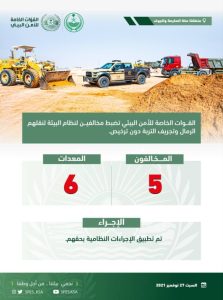ضبطت القوات الخاصة للأمن البيئي (5) مخالفين لنظام البيئة؛ لقيامهم بنقل الرمال وتجريف التربة دون ترخيص في منطقتي مكة المكرمة والجوف.