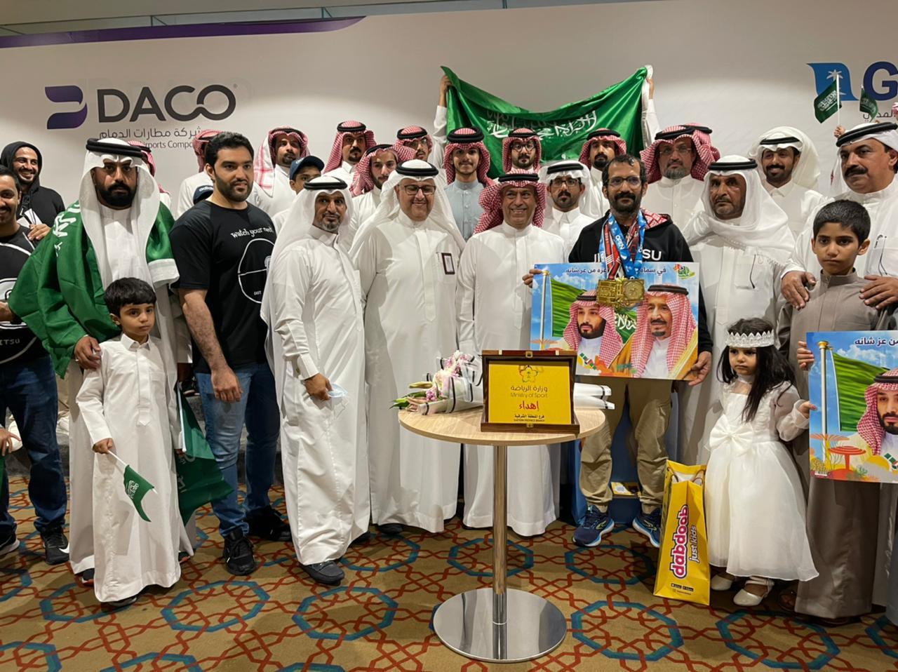 وقدم مدير مكتب وزارة الرياضة بالمنطقة الشرقية موفق السنيد، درع وزارة الرياضة، للبطل السعودي محمد جويعد ال مخلص، بطل العالم في رياضة الجوجيتسو، كما قدمت ادارة مطار الملك فهد هدايا بهذه المناسبة.