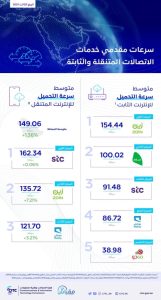 فيما تصدرت شركة “زين” قائمة مقدمي خدمات الاتصالات في سرعة الإنترنت للإنترنت الثابت بمتوسط سرعة تحميل يبلغ 154.44 ميجابت في الثانية، وجاءت شركة “سلام” في المركز الثاني بمتوسط سرعة يبلغ 100.02 ميجابت في الثانية، فيما حلت شركة “STC” في المركز الثالث بمتوسط سرعة يبلغ 91.48 ميجابت في الثانية.
