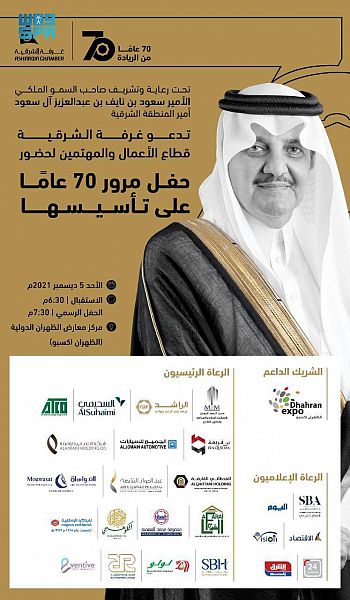 يرعى صاحب السمو الملكي الأمير سعود بن نايف بن عبدالعزيز أمير المنطقة الشرقية غداً احتفال غرفة الشرقية بمناسبة بمرور 70عامًا على تأسيسها ، وذلك بمركز معارض الظهران الدولية.