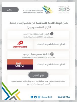 أعلنت الهيئة العامة للمنافسة عبر بيان رسمي اليوم عن رفضها لعملية استحواذ (شركة دليفري هيرو) على (شركة ذا شفز).