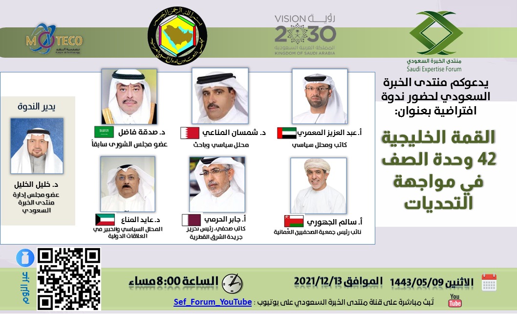 ينظم منتدى الخبرة السعودي وبالتزامن مع عقد القمة الخليجية 42 ندوة بعنوان ( القمة الخليجية 42 وحدة الصف في مواجهة التحديات ) يشارك فيها: الدكتور صدقة فاضل عضو مجلس الشورى سابقا من المملكة العربية السعودية والدكتور عايد المناع المحلل السياسي والخبير في العلاقات الدولية من دولة الكويت والدكتور شمسان المناعي محلل سياسي وباحث من مملكة البحرين والأستاذ جابر الحرمي رئيس تحرير جريدة الشرق وكاتب صحفي من دولة قطر والأستاذ سالم الجهوري نائب رئيس جمعية الصحفيين من سلطنة عمان والأستاذ عبدالعزيز المعمري كاتب ومحلل سياسي من دولة الإمارات و يديرها الدكتور خليل الخليل عضو مجلس الشورى سابقا وعضو مجلس إدارة منتدى الخبرة السعودي حاليا وذلك من خلال برنامج زوووم (ZOOM) غدا الأثنين 9 جمادى الأول 1443الموافق 13 ديسمبر 2021م الساعة الثامنة مساء وسوف تنقل مباشرة على قناة المنتدى في اليوتيوب