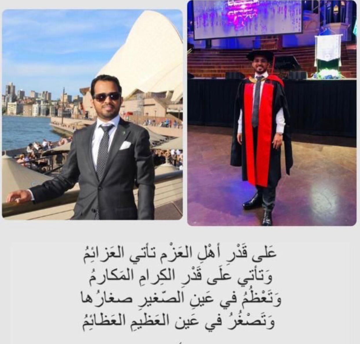 على قدر أهل العزم تأتي العزائم وعلى قدر أهل الكرم تأتي المكارم يحقق الشاب متعب حسين علي السني الزهراني درجة الدكتوراه من جامعة نيو ساوث ويلز الاسترالية منهياً بذلك ليالي من الجهد والإجتهاد