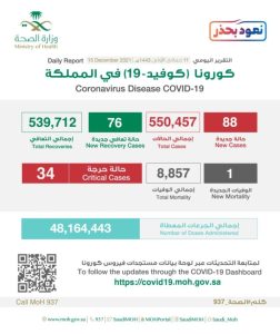 أعلنت وزارة الصحة إحصائية جديدة لمستجدات كورونا في المملكة خلال الـ24 ساعة الماضية تضمنت تسجيل (88) حالة مؤكدة وتعافي (76) حالة فيما بلغ عدد الحالات الحرجة (34) حالة.