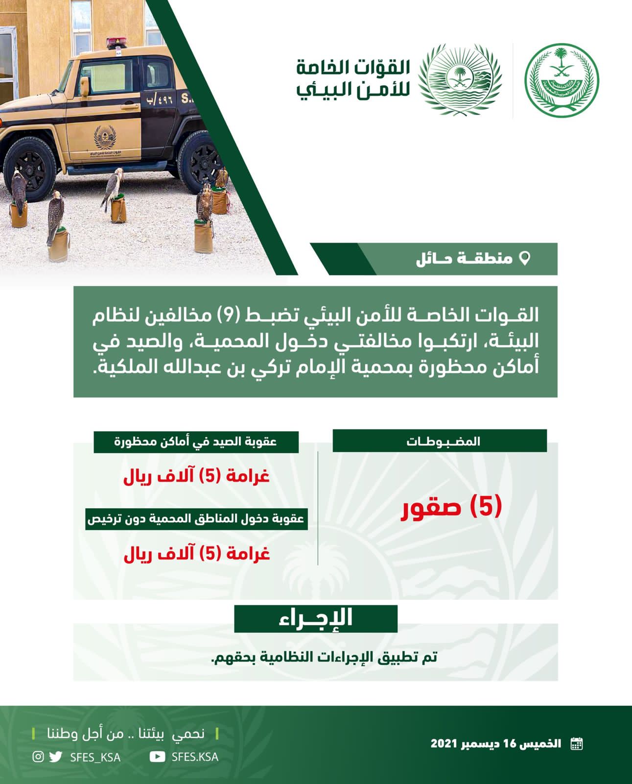 ضبطت القوات الخاصة للأمن البيئي (9) مخالفين لنظام البيئة، ارتكبوا مخالفتي دخول منطقة محمية دون ترخيص، والصيد في أماكن محظورة (بمحمية الإمام تركي بن عبدالله الملكية) في منطقة حائل، بحوزتهم (5) صقور تستخدم في الصيد، وتم تطبيق الإجراءات النظامية بحقهم.