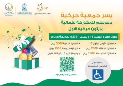 تنطلق يوم غد السبت فعاليات ماراثون حركية الرياضي الأول الذي تنظمه جمعية الإعاقة الحركية للكبار “حركية ” بمناسبة اليوم العالمي لذوي الإعاقة 2021، بجامعة الإمام محمد بن سعود الإسلامية ، وبمشاركة نحو 150 من الأشخاص ذوي الإعاقة الحركية ،