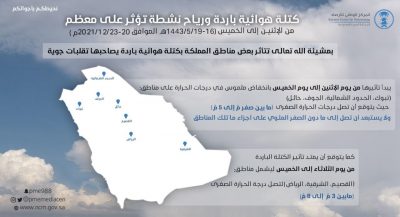 وأوضح المركز في تغريده عبر حسابه التدوينات القصيرة “تويتر” أن المناطق التي من المتوقع أن تتعرض لكتلة هوائية، تشمل الحدود الشمالية، والجوف، وتبوك، وحائل.