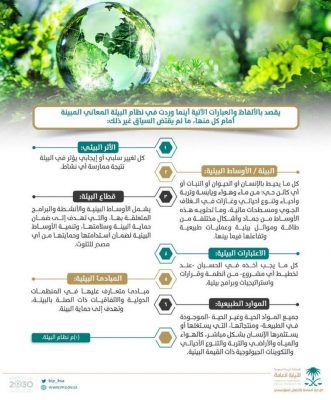 وبينت أن المبادئ البيئية مبادىئ متعارف عليها في المنظمات الدولية والاتفاقيات ذات الصلة بالبيئة وتهدف إلى حماية البيئة وحذرت من كل تغيير أو نشاط سلبي يؤثر على البيئة .