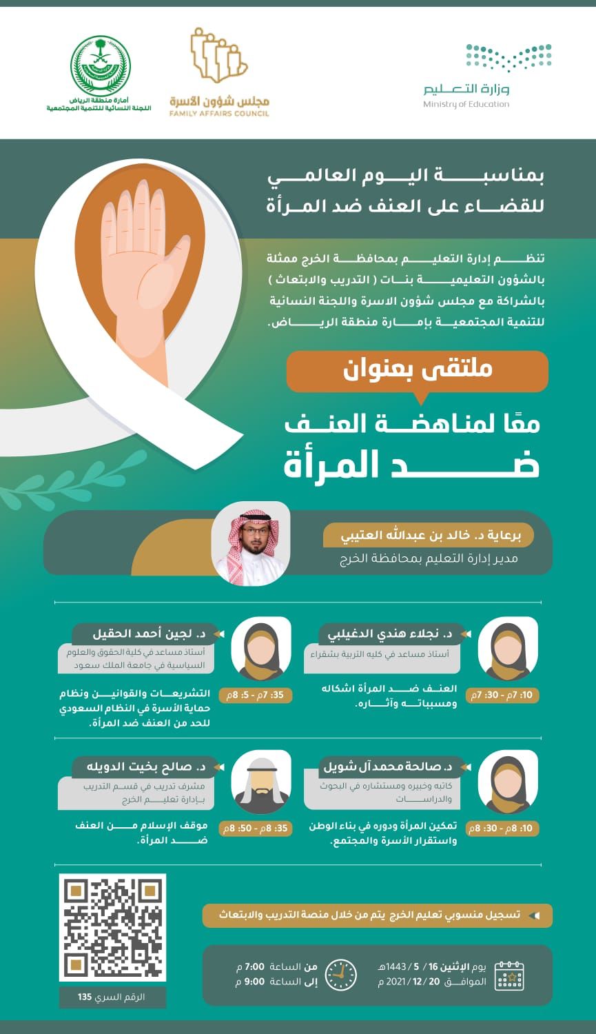 الموافق ١٦ /٥ /١٤٤٣هـ ملتقى عن بعد بعنوان ( معاً لمناهضة العنف ضد المرأة) وذلك بمناسبة اليوم العالمي للقضاء عن العنف ضد المرأة.