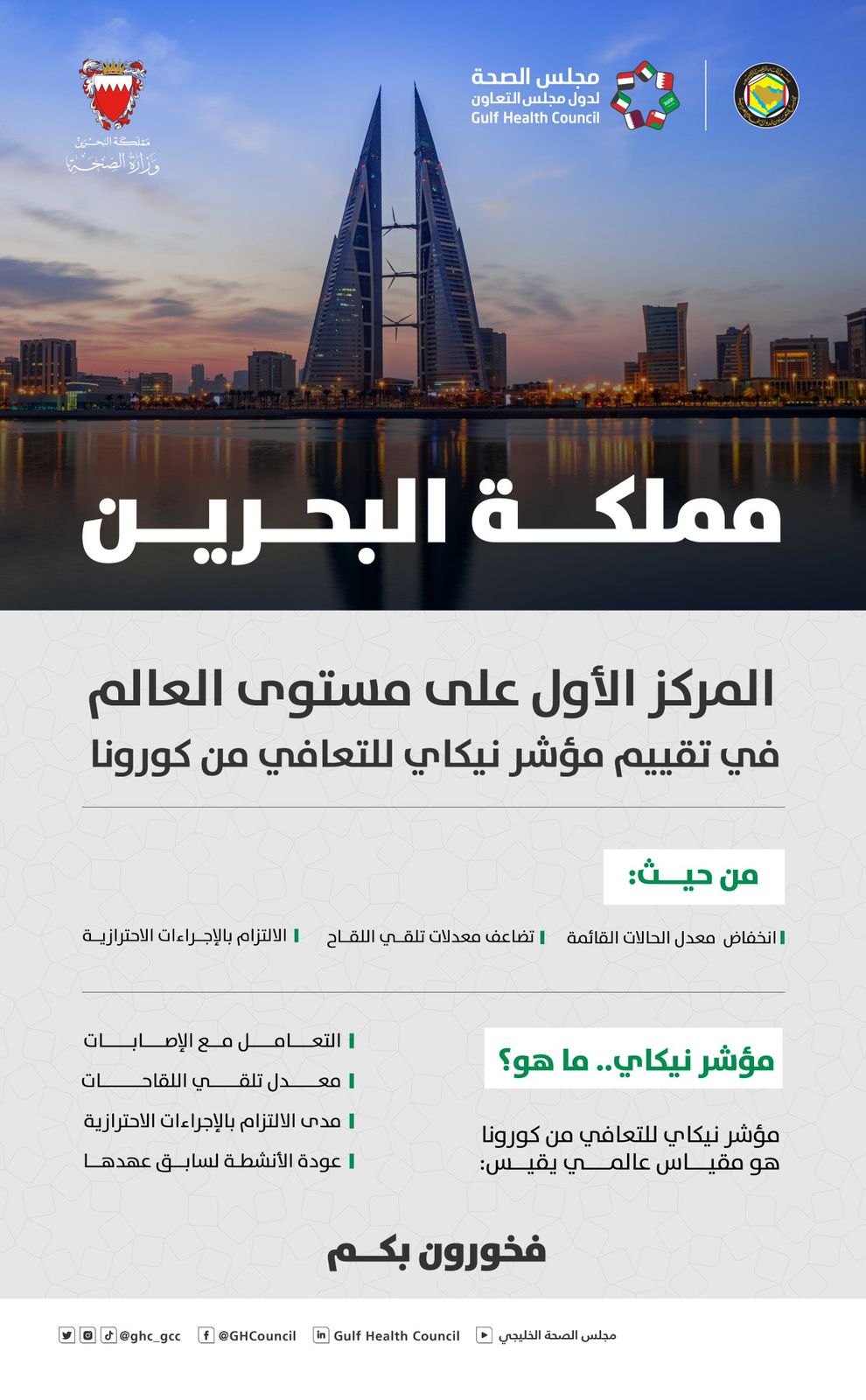 قال مجلس الصحة الخليجي أن مملكة البحرين حصدت على المركز الأول عالميًا في مؤشر نيكاي للتعافي من كورونا، وذلك من خلال تغريدة عبر حسابه الرسمي في تويتر .
