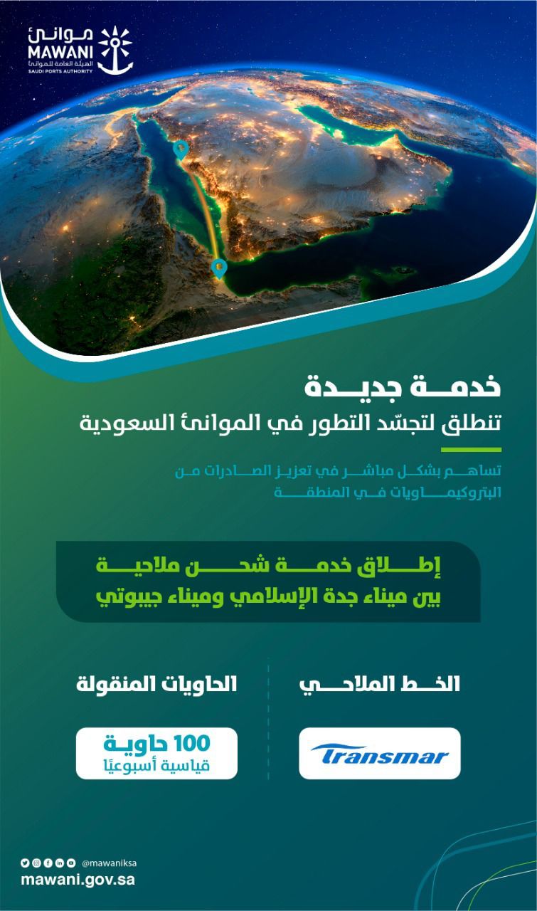 أعلنت الهيئة العامة للموانئ “موانئ”إضافة خدمة شحن ملاحية جديدة بين المملكة العربية السعودية ودولة جيبوتي عبر شركة “ترانسمار” الشركة الرائدة في مجال شحن الحاويات، في خطوة مهمة تهدف إلى تعزيز صادرات المملكة من البتروكيماويات في المنطقة، وزيادة عمليات المسافنة وشحن البضائع ونقلها ضمن الموانئ السعودية.