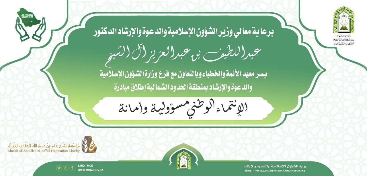 يقيم فرع وزارة الشؤون الإسلامية والدعوة والإرشاد بمنطقة الحدود الشمالية ،يوم الأحد الموافق ١٤٤٣/٥/٢٢ هـ ولمدة يومين ، مبادرة “الانتماء الوطني مسؤولية وأمانة” التي ينظمها معهد الأئمة والخطاء وتستهدف جميع منسوبي المساجد بالمنطقة من أئمة وخطباء ومؤذنين ومراقبين ومراقبات.