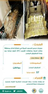 صرَّح المتحدث الرسمي للمديرية العامة لحرس الحدود العقيد مسفر القريني، بأن المتابعة الأمنية لمروجي ومهربي المخدرات، أسفرت عن تمكُّن الدوريات البرية بقطاع الدائر بمنطقة جازان من إحباط محاولات تهريب (57) كيلو جرامًا من مادة الحشيش المخدر، والقبض على المتهم فيها، وهو مواطن، وجرى إيقافه واتخذت بحقه الإجراءات النظامية الأولية، وتسليم المضبوطات لجهة الاختصاص.