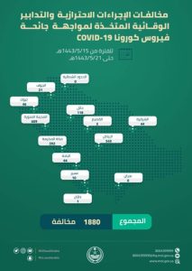 بلغت مخالفات الإجراءات الاحترازية والتدابير الوقائية من فيروس كورونا (COVID-19) (1880) مخالفة، وذلك للفترة من 15 / 5 / 1443هـ حتى 21/ 5/ 1443هـ.