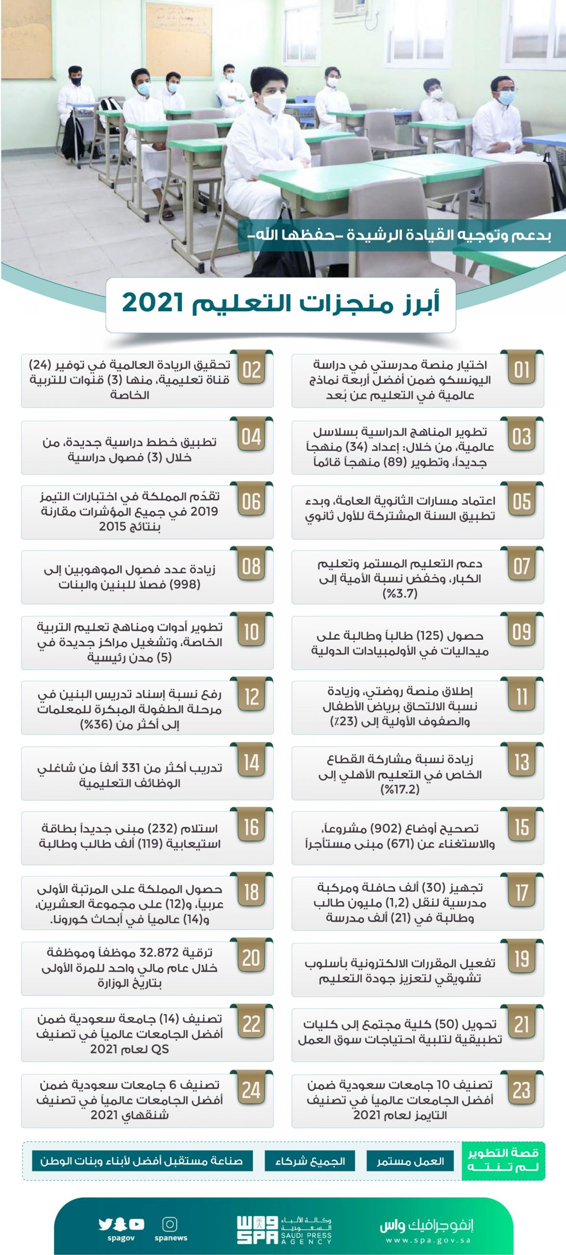 حقق قطاع التعليم في عام 2021 بدعم وتوجيه القيادة الرشيدة -حفظها الله- منجزات نوعية في تطوير منظومة التعليم وفق رؤية المملكة 2030، من خلال التعليم عن بُعد، وتطوير المناهج والخطط الدراسية، والتوسع في الطفولة المبكرة، وتعزيز موقع المملكة في التنافسية العالمية بتحقيق الجامعات السعودية مراتب متقدمة في التصنيفات الدولية.