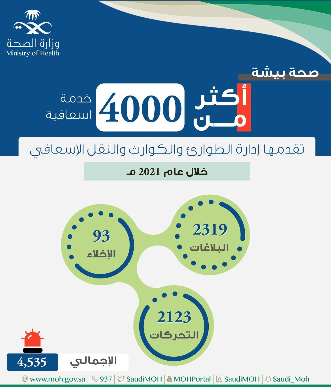 قدمت إدارة الطوارئ والكوارث والنقل الإسعافي بصحة بيشة 4535 خدمة إسعافية وذلك خلال عام 2021م ، مفيدة أن غرفة العمليات استقبلت 2319 بلاغ، و 93 إخلاء، وأيضاً 2123 تحرك اسعافي.
