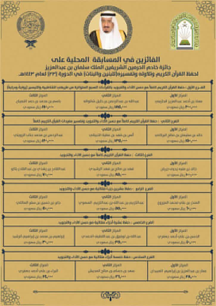 حيث فاز بالمركز الأول في الفرع الأول معاذ بن أحمد الحازمي وحصل على مبلغ 200.000 ريال، وبالمركز الثاني عبدالله بن عبدالرحمن شالواله وحصل على مبلغ 185.000 ريال، وبالمركز الثالث باسم بن محمد النصيان وحصل على مبلغ 170.000 ريال.