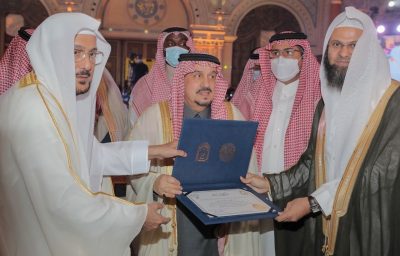 كما أكد سموه بأن الجائزة أسهمت خلال عقدين من الزمن بتعزيز قيم الوسطية والاعتدال في نفوس الناشئة وهي مستمرة على ذلك بفضل الله ثم بدعم خادم الحرمين الشريفين وسمو ولي عهده سائلا الله تعالى التوفيق للمتسابقين وأن يحافظوا على منهجهم وما اكتسبوه من علم ومعرفه، مثمنا سموه استمرار تنظيم الوزارة لهذه المسابقة خلال الفترة الماضية في ظل جائحة كورونا عبر الاتصال المرئي.