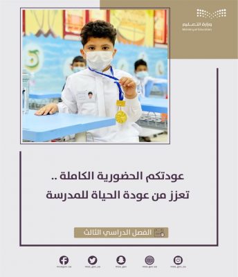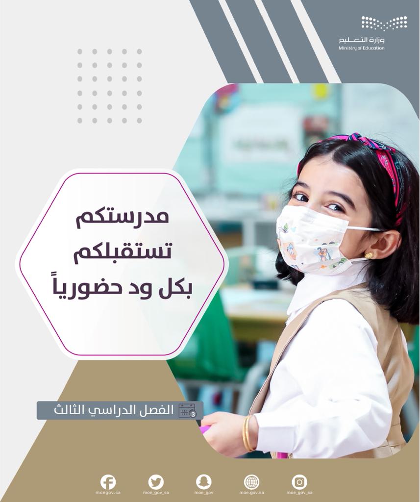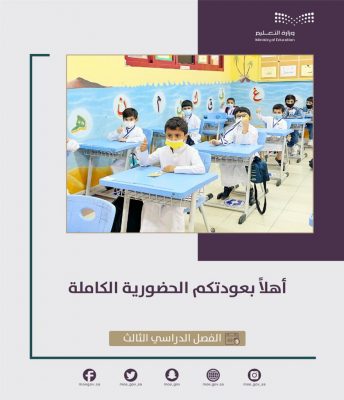 فيما اطلقت إدارة التعليم حزمة من العبارات الترحيبية في ظل خطة الوزارة الإعلامية للعودة الحضورية الكاملة للفصل الدراسي الثالث عبر حساباتها الرسمية وحسابات مكاتب التعليم والمدارس ابتهاجاً بانطلاق العملية التعليمية الحضورية الكاملة للفصل الدراسي الثالث.