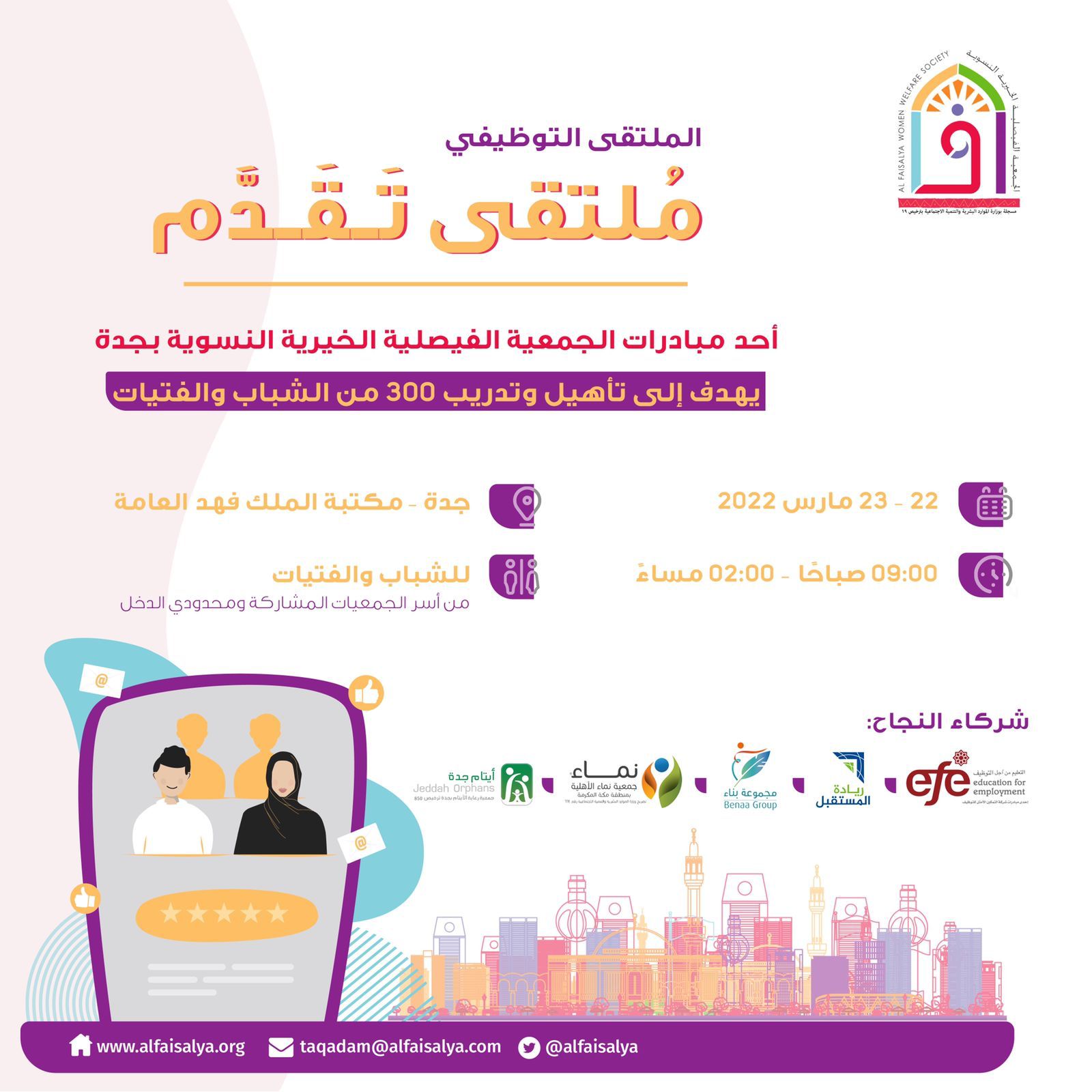 تطلق الجمعية الفيصلية الخيرية النسوية بجدة غداً فعاليات ملتقى تقدم للتوظيف في وذلك بمقر مكتبة الملك فهد العامة بجدة؛ ويستهدف 160 وظيفة في عدة مجالات مختلفة بالشراكة مع مؤسسات القطاع الخاص.