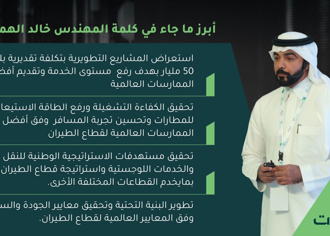 أكد نائب الرئيس التنفيذي لعمليات المطارات المهندس خالد الهماش، أن هناك مشاريع تطويرية بتكلفة تقديرية بلغت 50 مليار بهدف رفع مستوى الخدمة وتقديم أفضل الممارسات العالمية .
