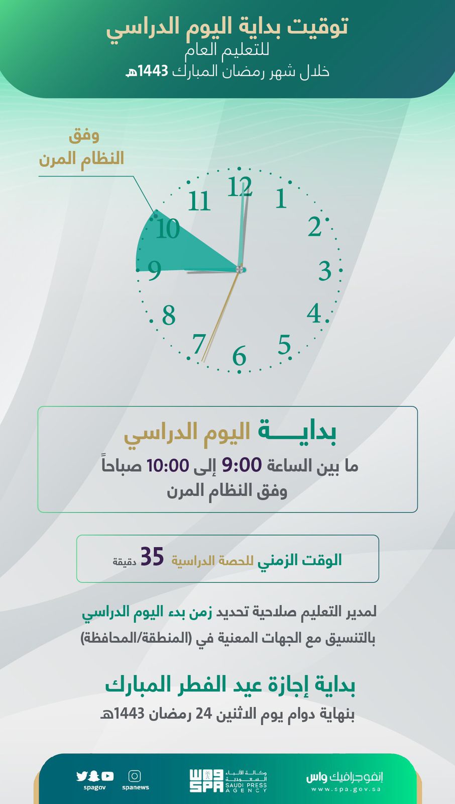 وحدّدت وزارة التعليم بدء اليوم الدراسي ما بين الساعة التاسعة إلى العاشرة صباحاً، وفق النظام المرن، مع تحديد الوقت الزمني للحصة الدراسية بـ 35 دقيقة، على أن تبدأ إجازة عيد الفطر المبارك بنهاية دوام يوم الاثنين 24 رمضان 1443هـ.