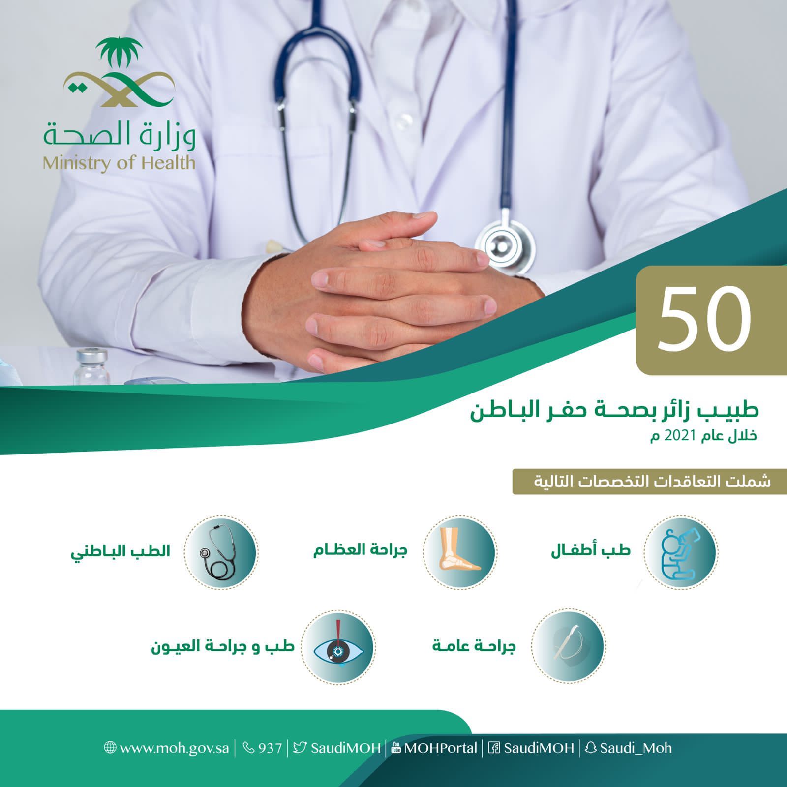 تعاقدت صحة حفر الباطن مع 50 طبيباً استشارياً ضمن برنامج الطبيب الزائر لعام 2021م ، وشملت التعاقدات عدد من التخصصات كطب الأطفال ، والطب الباطني ، والجراحة العامة, وطب جراحة العيون, وجراحة العظام.
