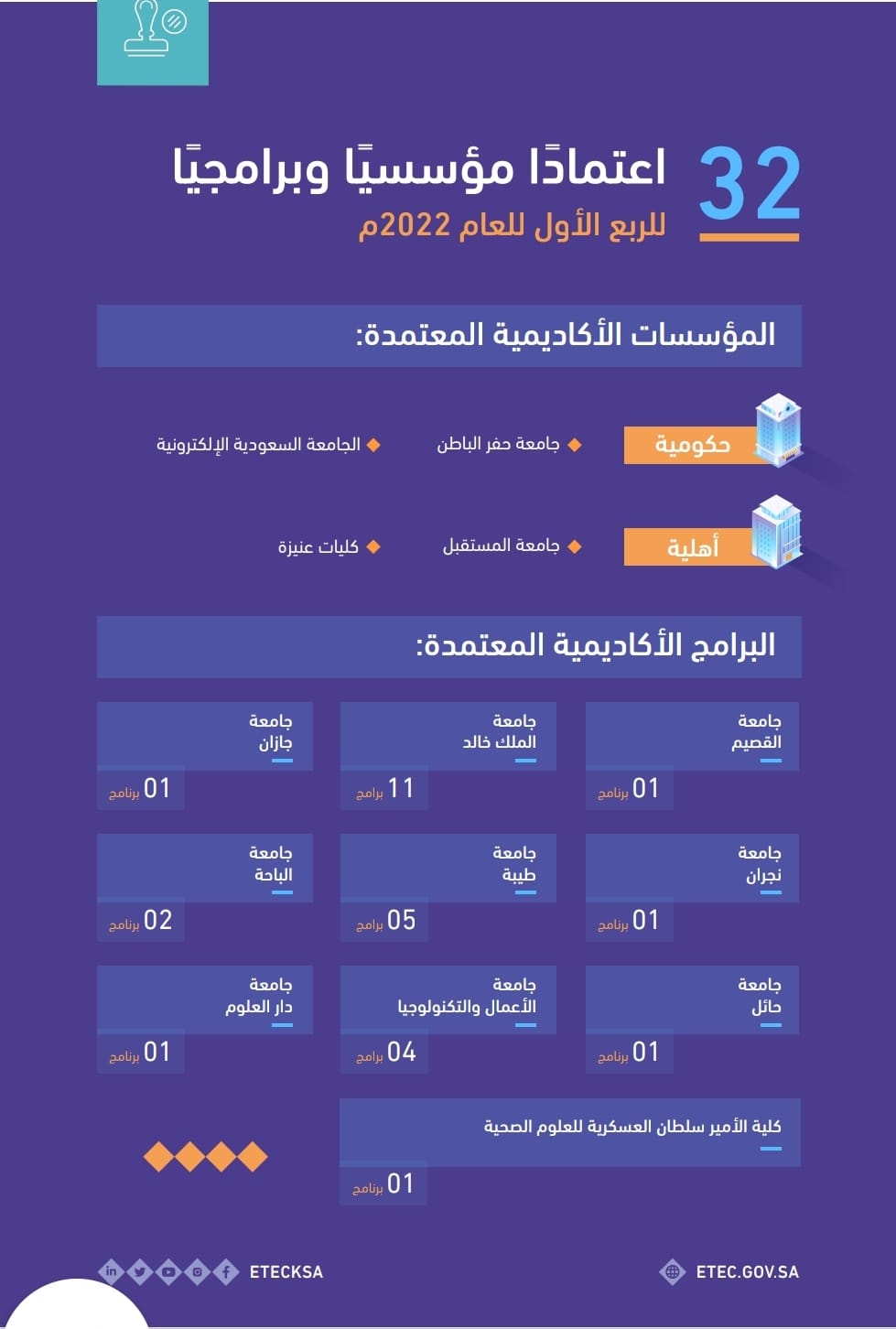 هيئة تقويم التعليم والتدريب تعتمد (4) مؤسسات تعليمية و (28) برنامجاً أكاديمياً خلال الربع الأول للعام 2022م