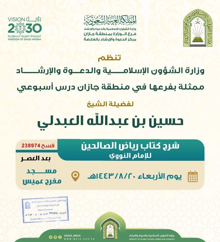 ينظم فرع وزارة الشؤون الإسلامية والدعوة والإرشاد في منطقة جازان ممثلا بمركز الدعوة بمحافظة العارضة درس علمي يقدمه فضيلة الشيح حسين بن عبد الله العبدلي يشرح فيه كتاب رياض الصالحين للأمام النووي مساء كل يوم أربعاء ابتداءاً من هذا اليوم الاربعاء العشرون من شهر شعبان ١٤٤٣ هجرية والذي سيقام في مسجد مفرح عميس .
