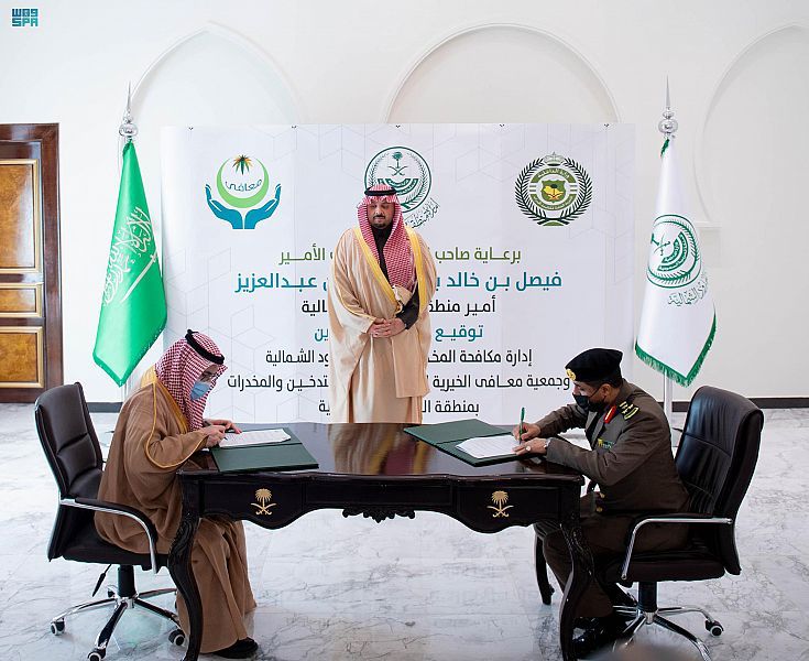 شهد صاحب السمو الملكي الأمير فيصل بن خالد بن سلطان بن عبدالعزيز أمير منطقة الحدود الشمالية بمقر الإمارة اليوم, توقيع اتفاقية تعاون بين مديرية مكافحة المخدرات بالمنطقة وجمعية معافى للتوعية بأضرار التدخين والمخدرات بالحدود الشمالية.