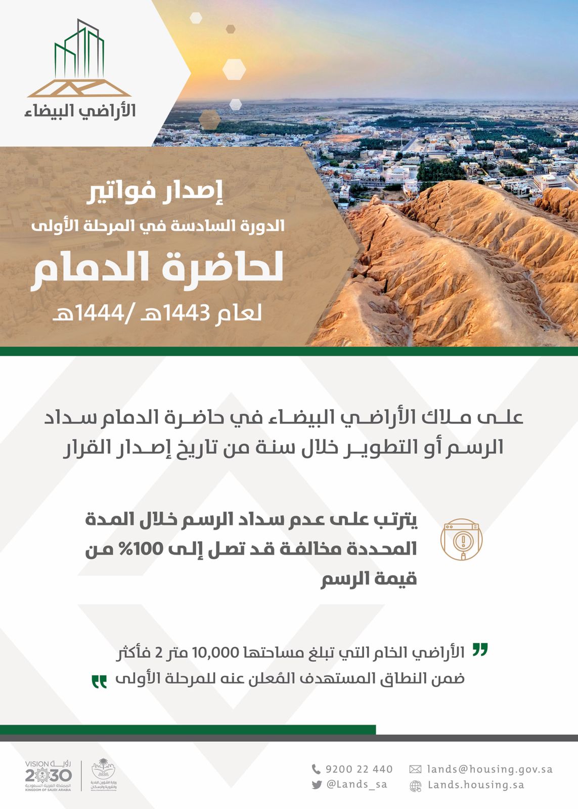 أصدر برنامج “الأراضي البيضاء” رسومه للدورة السادسة في المرحلة الأولى لحاضرة الدمام لعام 1443 – 1444هــ، داعياً ملاك الأراضي المعنية إلى المبادرة بتطوير أراضيهم أو السداد خلال سنة من تاريخ إصدار القرار.