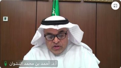 وعقب ذلك، تناول عميد كلية التربية الأستاذ الدكتور أحمد بن محمد النشوان التعليم الأخضر كأحد الفلسفات التي ترتبط ارتباطاً وثيقا بمفهوم التنمية المستدامة والشاملة والحفاظ على البيئة؛ حيث يسعى هذا النوع من التعليم إلى تحقيق التنمية المستدامة ومواكبة التطور التكنولوجي والاستفادة منه وفق معايير صديقة للبيئة، كما تناول دور الجامعات السعودية بشكل عام، وجامعة الإمام محمد بن سعود الإسلامية بشكل خاص في خلق نموذج تربوي وأكاديمي لممارسة التعليم الأخضر، مؤكداً في ختام كلمته بأن ممارسة التعليم الأخضر والاستفادة منه مسؤولية فردية جامعية، وقد أدت فيها حكومتنا تحت قيادة مولاي خادم الحرمين الشريفين وسمو ولي عهده الأمين حفظهما الله دورها بكفاءة واقتدار بما يكفل حق الأجيال الحالية والمستقبلية في العيش في بيئة آمنة وصحية، خضراء ومستدامة.