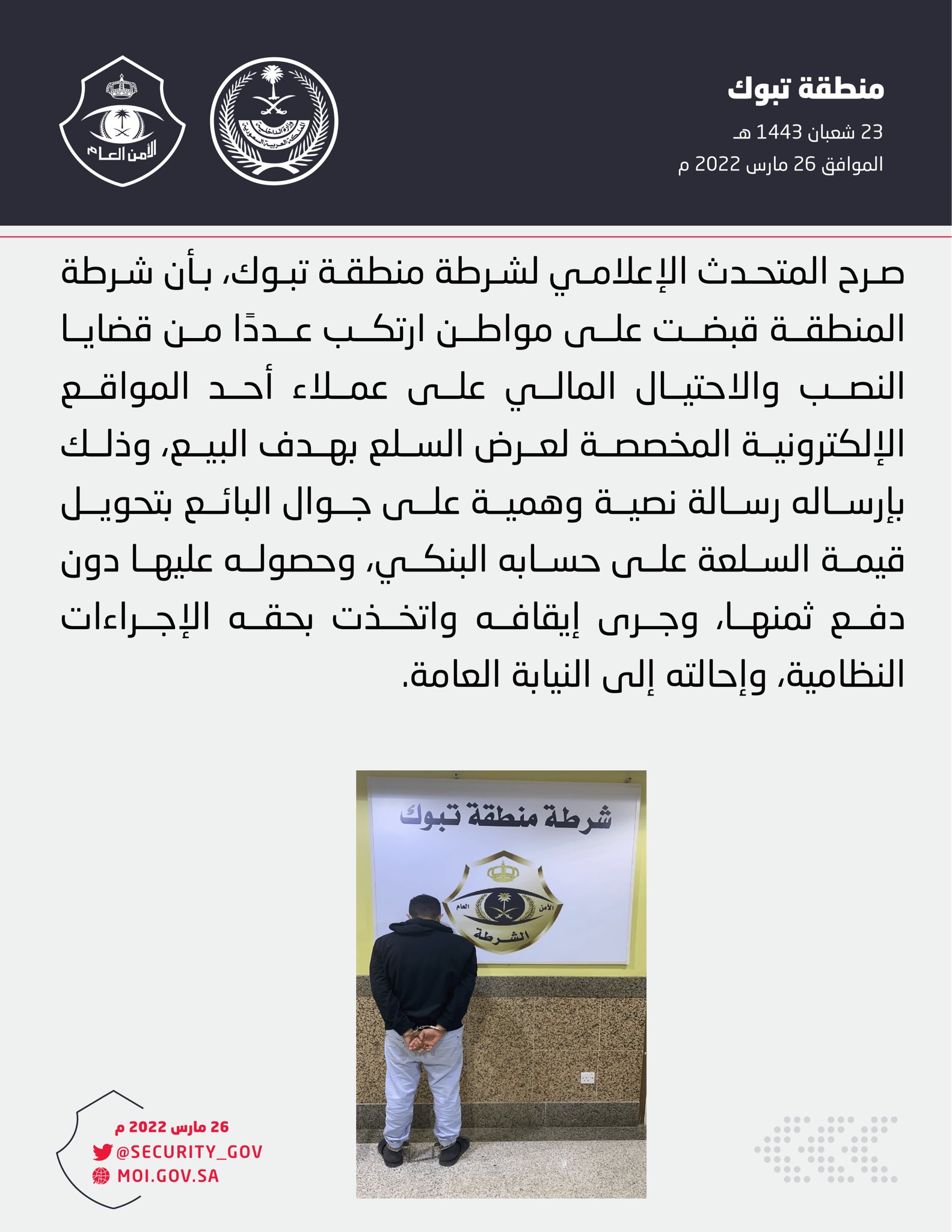 صَرَّحَ المتحدث الإعلامي لشرطة منطقة تبوك، بأن شرطة المنطقة قبضت على مواطن ارتكب عددًا من قضايا النصب والاحتيال المالي على عملاء أحد المواقع الإلكترونية المخصصة لعرض السلع بهدف البيع، وذلك بإرساله رسالة نصية وهمية على جوال البائع بتحويل قيمة السلعة على حسابه البنكي، وحصوله عليها دون دفع ثمنها، وجرى إيقافه واتخذت بحقه الإجراءات النظامية، وإحالته إلى النيابة العامة.