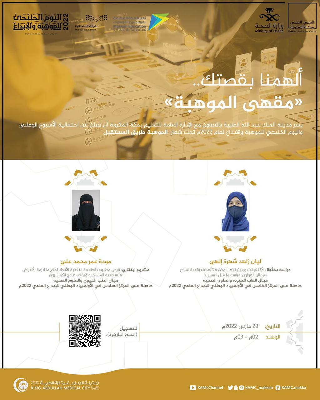 تشارك الإدارة العامة للتعليم بمنطقة مكة المكرمة ممثلة في إدارة الموهوبين في إحتفالية الأسبوع الوطني واليوم الخليجي للموهبة والإبداع لعام 2022 ، تحت شعار ” الموهبة طريق المستقبل خلال الفترة من اليوم الأحد 27 مارس إلى يوم بعد غد الثلاثاء 29 مارس ، حيث تتضمن الفعاليات محاضرات وورش عمل تستهدف المختصين والمعلمين والمعلمات في مجال الموهبة ؛ وكذلك الطلاب والطالبات في التعليم ومجال الموهبة ؛ وذلك بالتعاون مع مدينة الملك عبدالله الطبية بالعاصمة المقدسة .