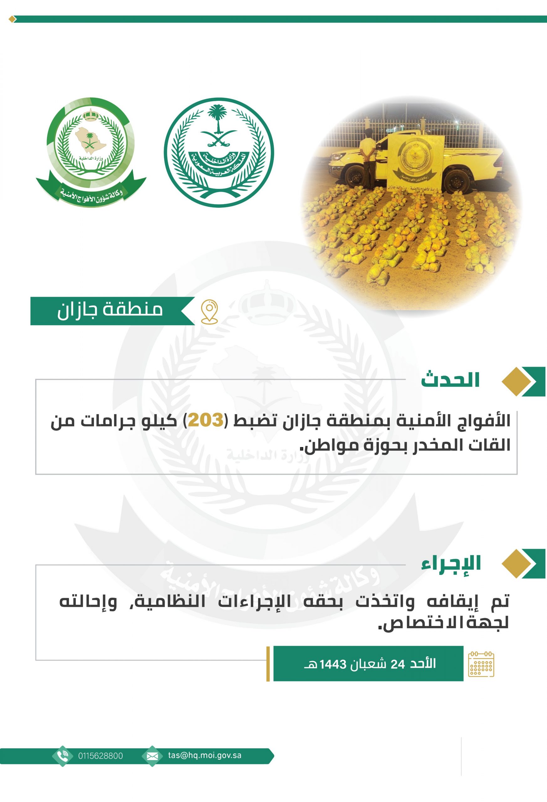 الأفواج الأمنية بمنطقة جازان تضبط (203) كيلو جرامات من القات المخدر بحوزة مواطن.