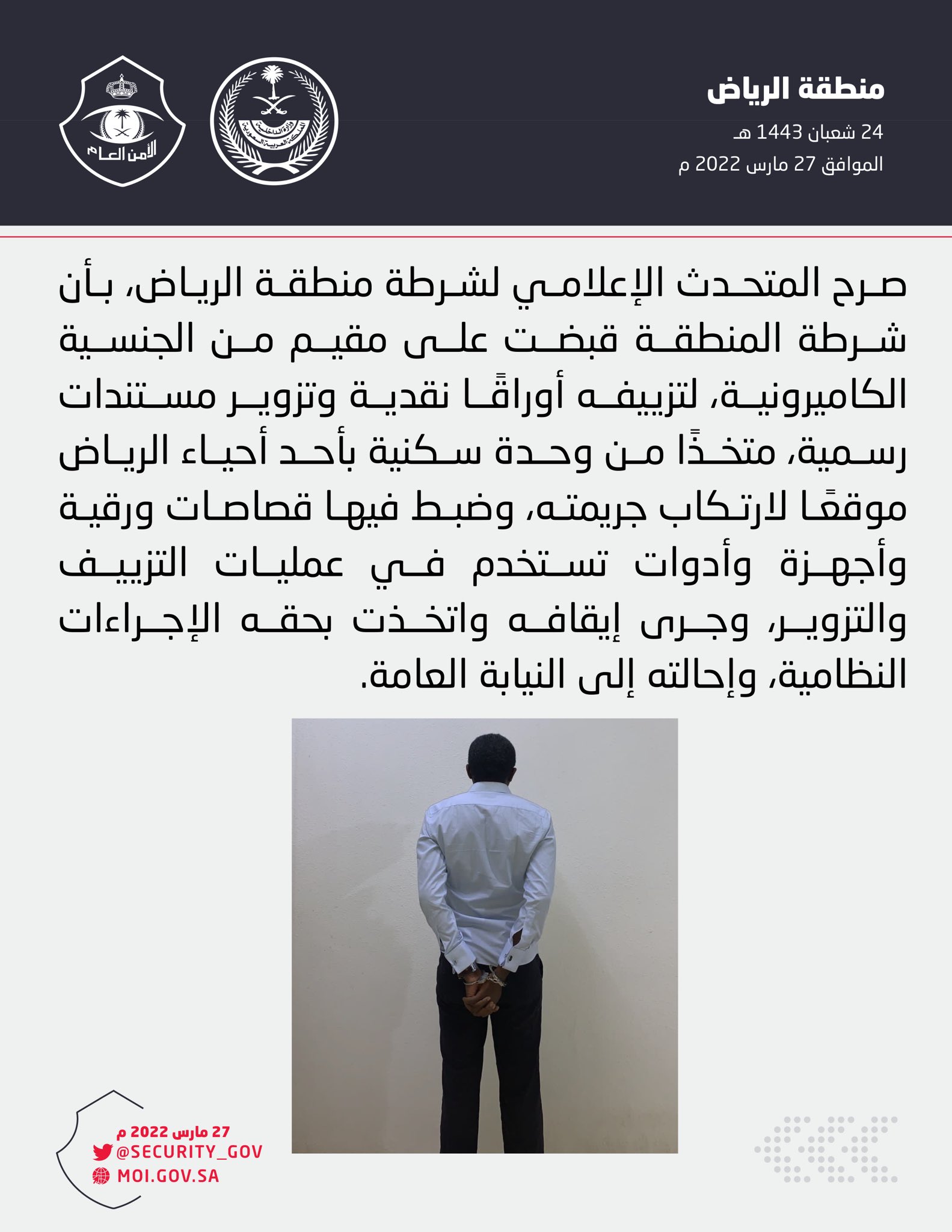 صرّح المتحدث الإعلامي لشرطة منطقة الرياض بأن شرطة المنطقة قبضت على مقيم من الجنسية الكاميرونية، لتزييفه أوراقًا نقدية وتزوير مستندات رسمية، متخذًا من وحدة سكنية بأحد أحياء الرياض موقعًا لارتكاب جريمته، وضبط فيها قصاصات ورقية وأجهزة وأدوات تستخدم في عمليات التزييف والتزوير، وجرى إيقافه واتخذت بحقه الإجراءات النظامية، وإحالته إلى النيابة العامة.