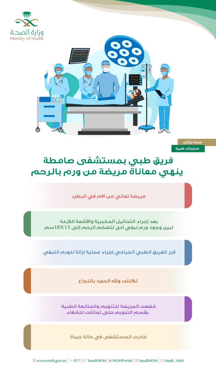 قالت صحة جازان بأن فريق طبي بمستشفى صامطة العام تمكن من إنهاء معاناة مريضة في العقد الثالث من العمر كانت تعاني من ورم ليفي في الرحم وذلك بعد إجراء عملية جراحية تم فيها إستئصال الورم تكللت ولله الحمد بالنجاح.