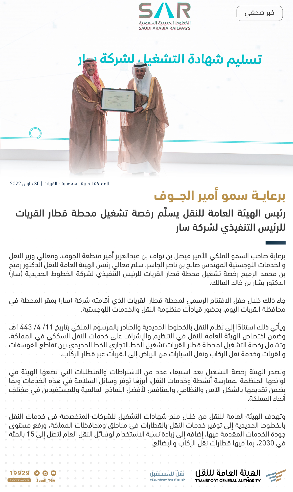برعاية وحضور صاحب السمو الملكي الأمير فيصل بن نواف بن عبدالعزيز أمير منطقة الجوف، و معالي وزير النقل والخدمات اللوجستية المهندس صالح بن ناصر الجاسر ، سلم معالي رئيس الهيئة العامة للنقل الدكتور رميح بن محمد الرميح رخصة تشغيل محطة قطار القريات لسعادة الرئيس التنفيذي لشركة الخطوط الحديدية (سار) الدكتور بشار بن خالد المالك، جاء ذلك خلال حفل الافتتاح الرسمي لمحطة قطار القريات والذي أقامته شركة (سار) بمقر المحطة في محافظة القريات اليوم الأربعاء 27 شعبان 1443هـ الموافق 30 مارس 2022م، وبحضور قيادات منظومة النقل والخدمات اللوجستية، ورجال الأعمال في منطقة الجوف.