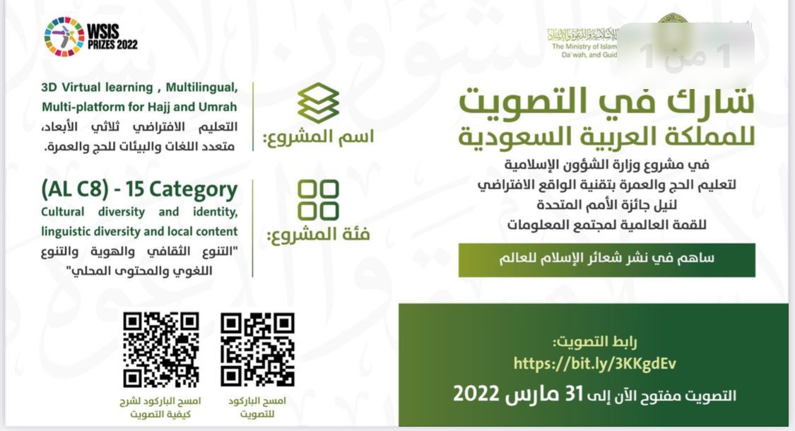 بدء العد التنازلي للتصويت لمشروع تقدمت به المملكه للمنافسة بالفوز بجائزة الأمم المتحدة عبر برنامج التعليم الافتراضي ثلاثي الأبعاد للحج والعمرة ، والذي يختتم التصويت بنهاية يوم 31 من مارس الجاري، حيث يمكن التصويت عبر الرابط