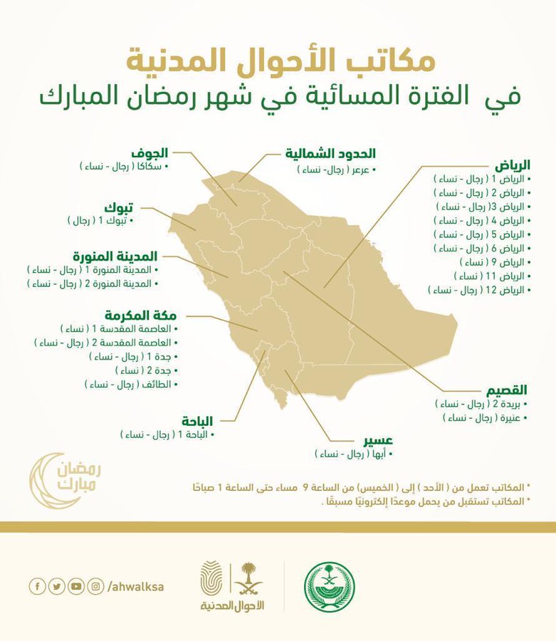أعلنت الأحوال المدنية مواعيد تقديم خدماتها للمستفيدين الحاصلين على مواعيد من منصة وزارة الداخلية الإلكترونية “أبشر”، في الفترة المسائية خلال شهر رمضان المبارك في (41) مكتبًا للنساء والرجال في مناطق المملكة.