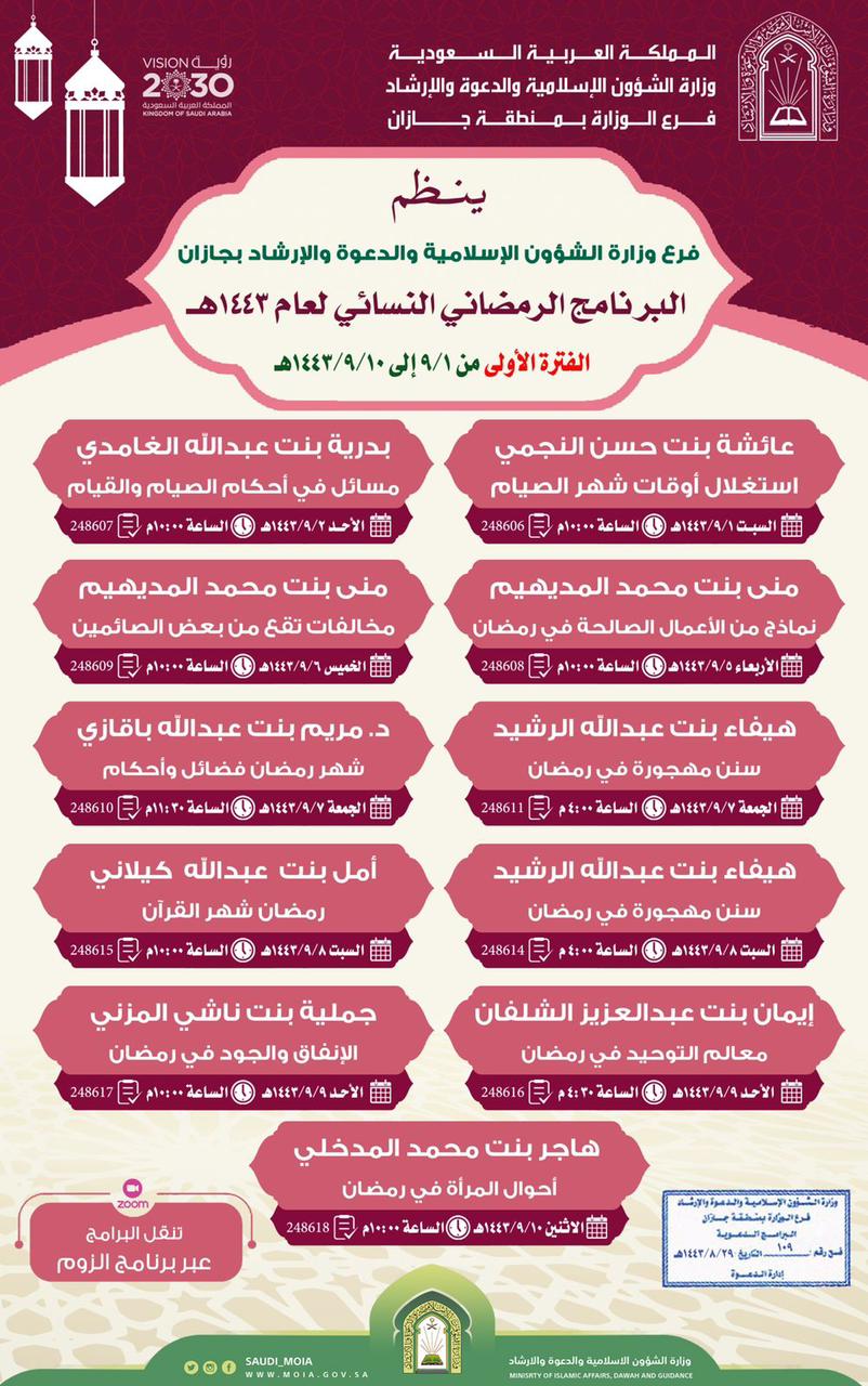 ينظم فرع وزارة الشؤون الإسلامية والدعوة والإرشاد في منطقة جازان ممثلاً بإدارة الشؤون النسائية البرنامج الدعوي النسائي لشهر رمضان لهذا العام ١٤٤٣هـ للفترة الأولى من ١٤٤٣/٩/١هـ إلى ١٤٤٣/٩/١٠هـ تقدم جميع المحاضرات عبر برنامج الزوم طيلة رمضان المبارك.