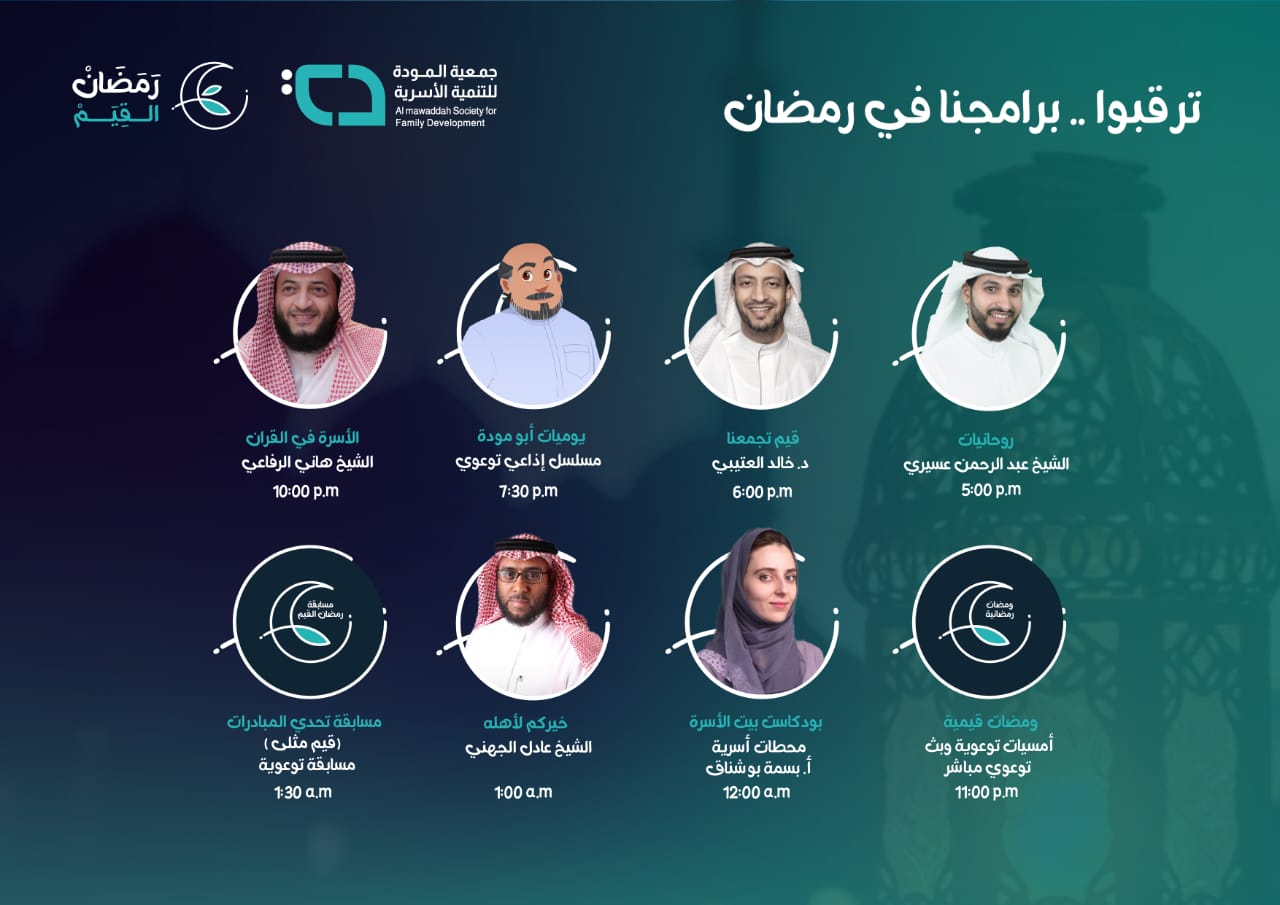 اطلقت جمعية المودة حملتها التوعوية الرمضانية في منطقة مكة المكرمة لعام 1443ه (رمضان القيم) والتي تهدف الى رفع وعي الأسرة في تعاملاتهم وتقوية الأواصر بين افراداها من خلال هدي القرآن الكريم وسيرة المصطفى صلى الله عليه وسلم في تعامله مع زوجاته وبناته. وأشار رئيس مجلس الإدارة م. فيصل السمنودي أن الجمعية حرصت على تقديم حملة رمضانية تقدم برامج نوعية تتناسب مع جميع أفراد الأسرة.