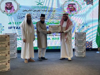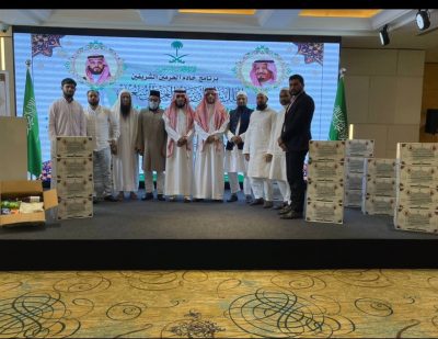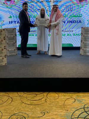 وأشار القائم بأعمال السفارة السعودية بنيودلهي ماجد بن عبدالرحمن العتيبي إلى أن هذه الهدية التي تُوزع عن طريق سفارات المملكة في العالم والملحقيات الدينية فيها تُعبر عن الاهتمام البالغ بإخواننا المسلمين ومشاركتهم فرحة شهر رمضان المبارك، كما تحرص على مد يد الخير والبر للمسلمين حول العالم، مقدماً شكره وتقديره لوزارة الشؤون الإسلامية لحرصها على تنفيذ البرنامج رغم استمرار جائحة كورونا.