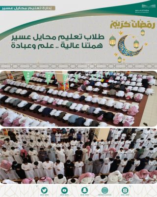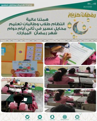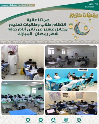 انتظم طلاب وطالبات تعليم محايل عسير لعدد 91 ألف طالب وطالبة لكافة المراحل الدراسية في 792 مدرسة مع بداية الدراسة لشهر رمضان المبارك في جميع مراحل التعليم العام بهمة عالية وأجواء إيجابية داعمة لاستمرار العملية التعليمية خلال شهر رمضان المبارك.
